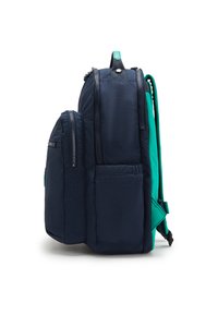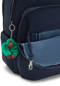 Marineblauer Rucksack mit strukturierter Oberfläche, vordere Reißverschlusstasche, grünem Logo und einem hängenden grünen Schlüsselanhänger. Verstellbare Schultergurte.