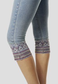 Hellblaue Capri-Jeans mit dekorativen bestickten Bündchen in Lila und Grau. Verfügt über eine figurbetonte Passform und ein Fünf-Taschen-Design.