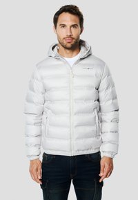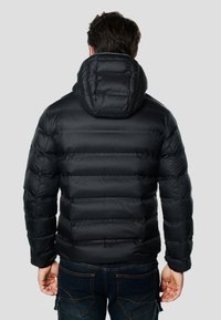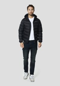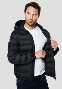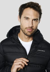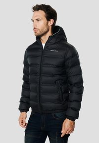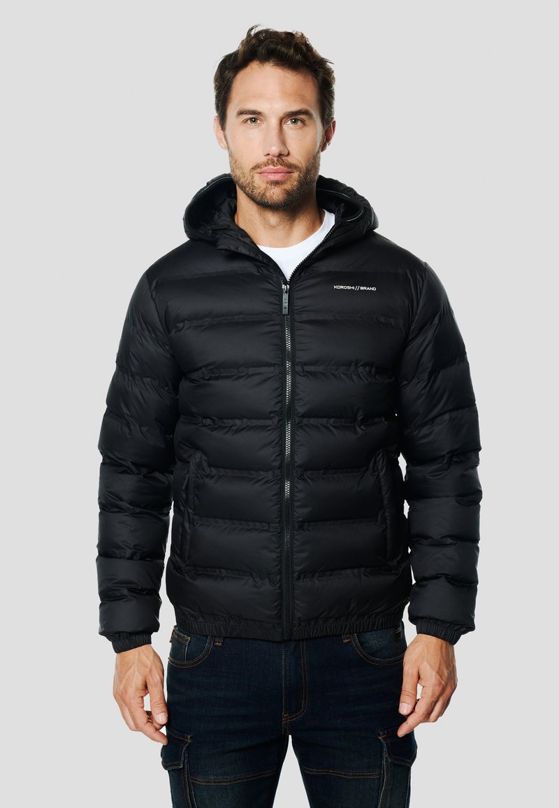 Schwarze Steppjacke mit Kapuze, gesteppte Optik, Reißverschluss, elastische Bündchen und Saum. Verfügt über ein Logo auf der Brust und ein glattes, glänzendes Material.