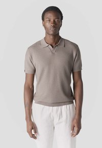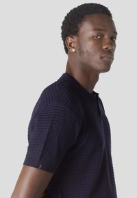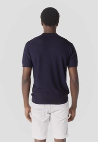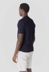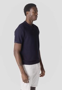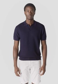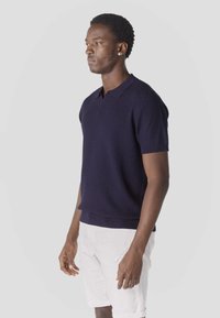 Junger Mann steht, trägt ein strukturiertes, marineblaues Polohemd mit kurzen Ärmeln und weiße, abgenutzte Shorts vor einem schlichten, hellen Hintergrund.