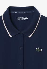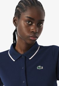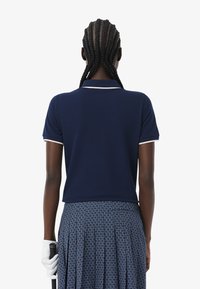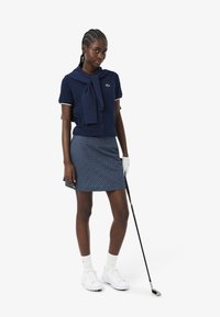Frau trägt ein marineblaues Polohemd mit kurzen Ärmeln und einen gemusterten Rock, hält einen Golfclub mit weißem Handschuh an der rechten Hand.