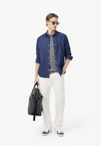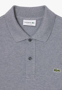 Graues Poloshirt aus Baumwolle mit klassischem Kragen und kurzen Ärmeln. Lacoste-Logo in Grün auf der Brust, kombiniert mit weißer Hose.