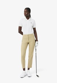 Frau mit geflochtenem Haar, die ein weißes Polohemd mit kurzen Ärmeln und beige Hose mit hoher Taille trägt, vor einem schlichten weißen Hintergrund stehend.