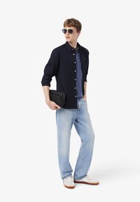 Marineblaues Poloshirt aus Baumwollmaterial, mit Kragen, zwei Knöpfen und einem grünen, aufgestickten Logo auf der linken Brust. Hellblaue Jeans.