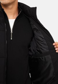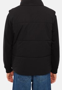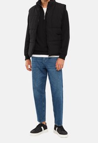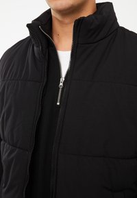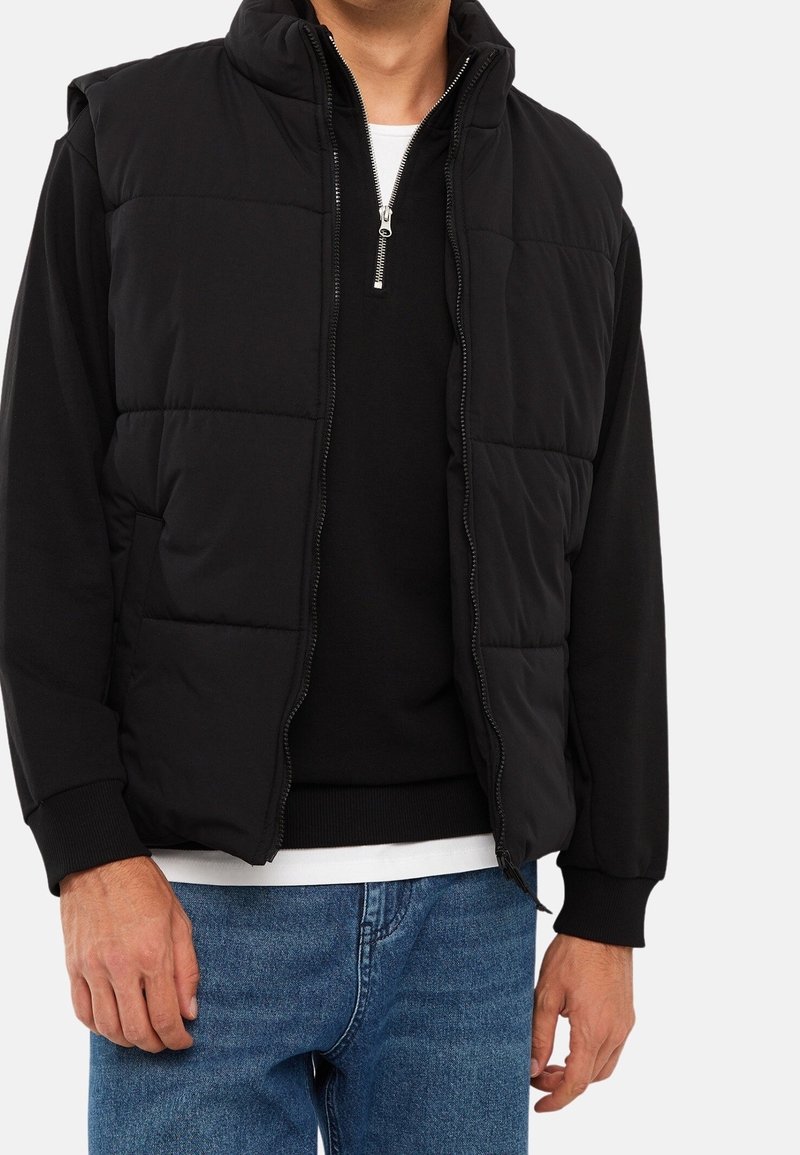Schwarze Steppweste mit hohem Kragen, Reißverschluss und zwei Seitentaschen, über einem schwarzen Pullover und einem weißen Hemd getragen. Lässige Jeans.