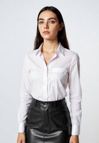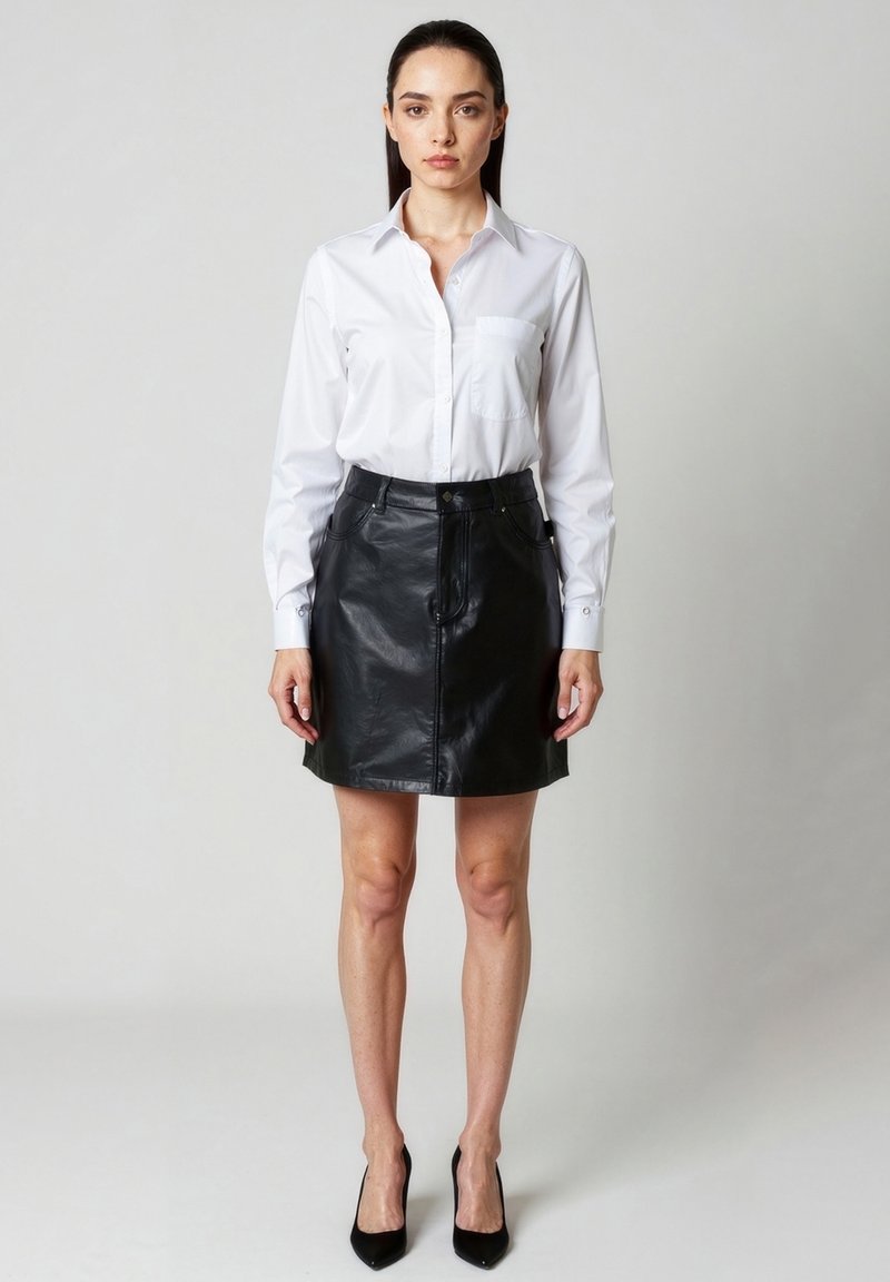 Frau steht frontal, trägt ein weißes Hemd mit Knöpfen, einen schwarzen Lederrock und schwarze hohe Absätze vor einem schlichten grauen Hintergrund.