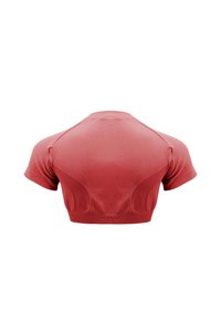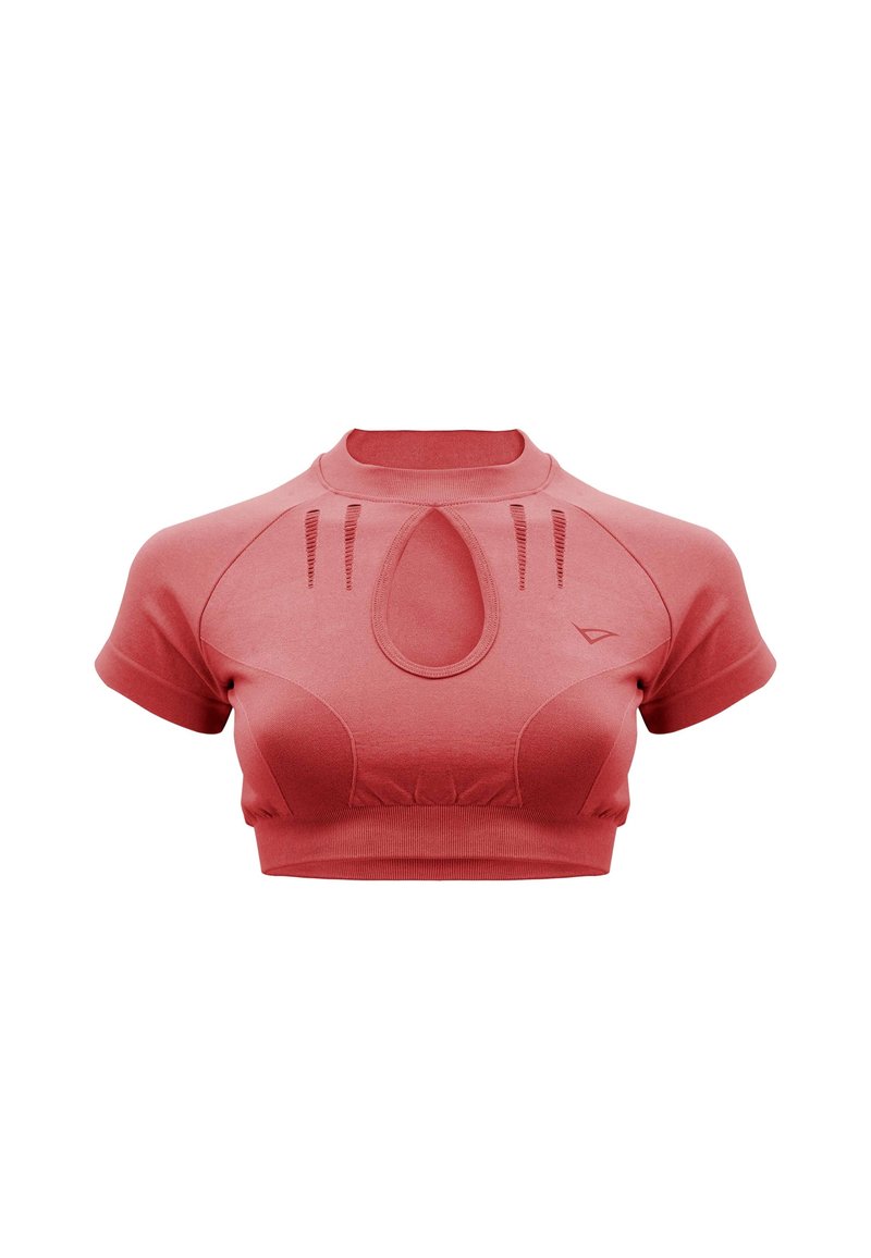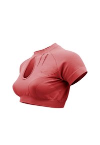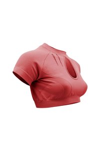 Korallenrotes, kurzes Sportoberteil mit kurzen Ärmeln, tropfenförmigem Ausschnitt vorne, geripptem Saum und dezenten Belüftungsschlitzen auf der Brust.
