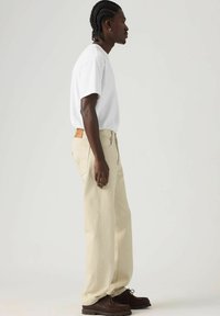 Beige Jeans aus Denim mit gerader Passform und Fünf-Taschen-Design, versehen mit kupferfarbenen Nähten und einer dezenten Textur, kombiniert mit braunen Schuhen.