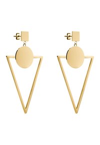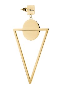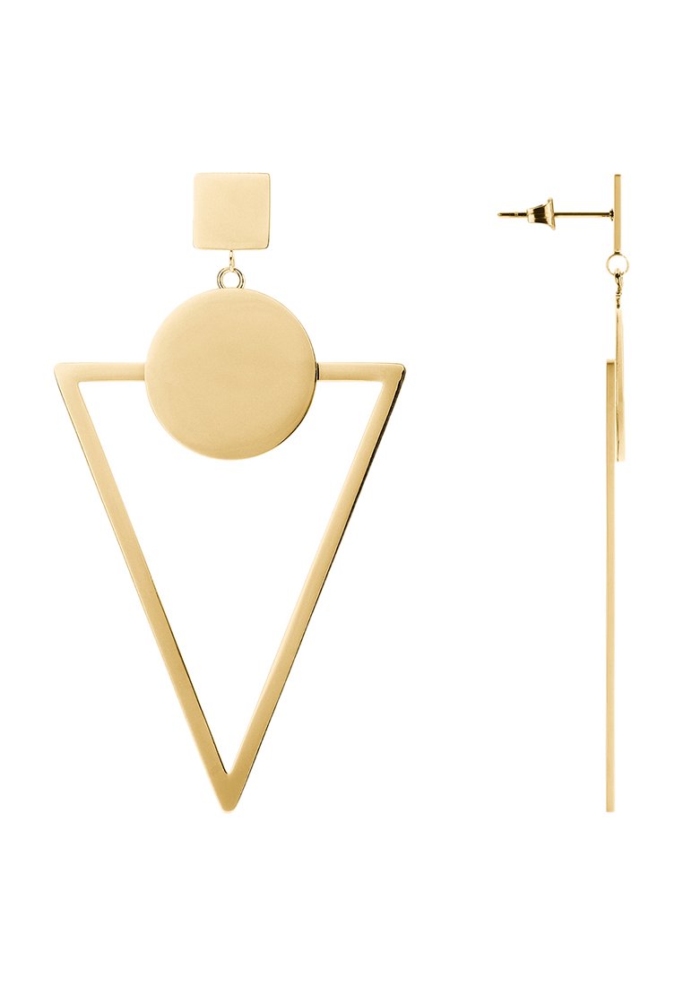Goldfarbene Ohrringe mit geometrischen Formen: ein quadratischer Stecker, ein kreisförmiger Anhänger und ein dreieckiger Tropfen, alle mit einer glatten, polierten Oberfläche.