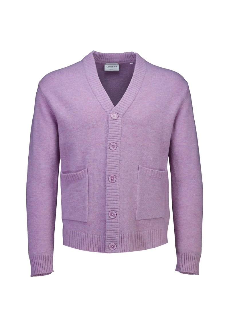 Lavendelfarbene Strickjacke mit V-Ausschnitt, geripptem Kragen und Bündchen, fünf Knopfverschluss und zwei vorderen Taschen. Weiches Strickmaterial mit strukturierter Oberfläche.