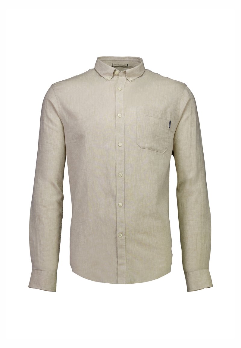 Beiges Leinenhemd mit langen Ärmeln, einem Button-Down-Kragen und einer aufgesetzten Tasche auf der linken Brust. Glatte Textur mit dezentem Muster.