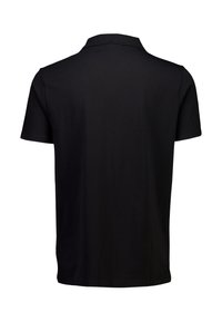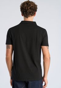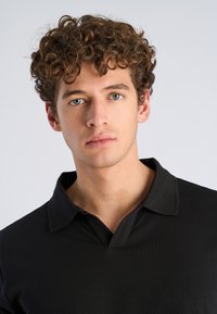 Junger Mann mit lockigem Haar, trägt ein schwarzes Polohemd und Jeans, steht mit verschränkten Armen, zeigt Tätowierungen auf seinen Unterarmen vor einfachem Hintergrund.