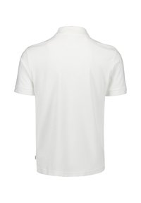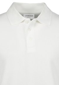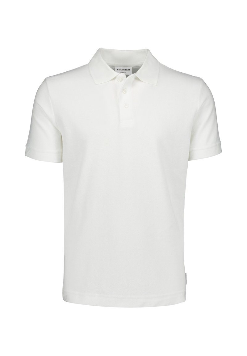 Weißes Poloshirt mit kurzen Ärmeln, drei Knöpfen und einem Kragen, dargestellt vor einem schlichten weißen Hintergrund.