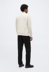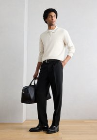 Mann mit lockigem Haar, der ein cremefarbenes langärmliges Poloshirt trägt, das in schwarze Hosen gesteckt ist, mit Händen in den Taschen vor einem einfarbigen Hintergrund.