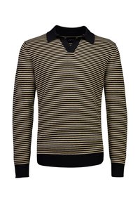 Junger Mann mit lockigem Haar, der einen beigen, gestreiften Langarm-Polopullover und dunkle Hosen trägt, blickt nach rechts und hat die Hände in den Taschen.