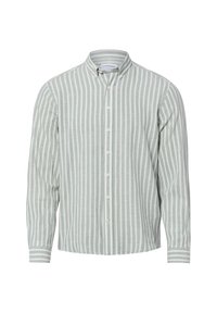 Hellblau- und cremegestreiftes Button-Down-Hemd mit Kragen, langen Ärmeln und geradem Saum, aus einem atmungsaktiven Stoff gefertigt.