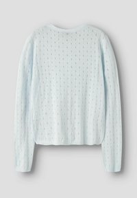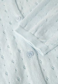 Hellblauer Strickcardigan mit langen Ärmeln, rundem Ausschnitt, vorderer Knopfleiste und feinem Lochmuster durchgehend.