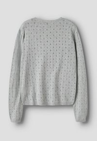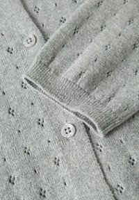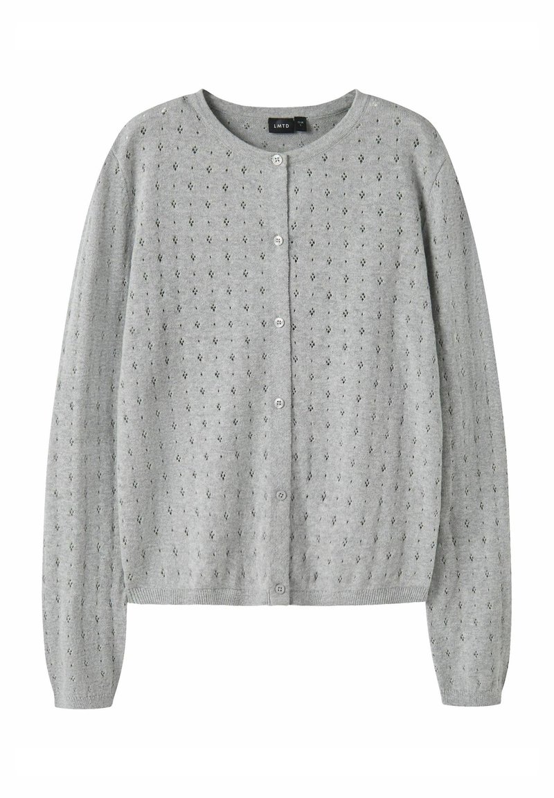 Hellgraue, langärmelige Strickjacke mit kleinem Lochmuster, rundem Ausschnitt und weißer Knopfleiste vorne.