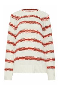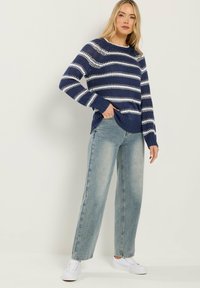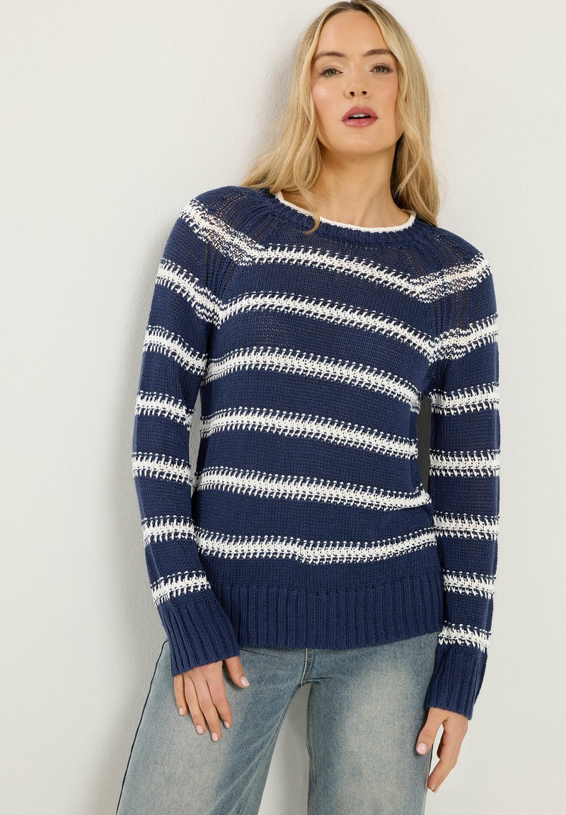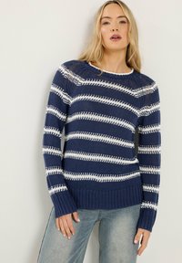 Frau trägt einen marineblauen Strickpullover mit weißen horizontalen Streifen und hellblauen Jeans, steht vor einer schlichten hellen Wand.