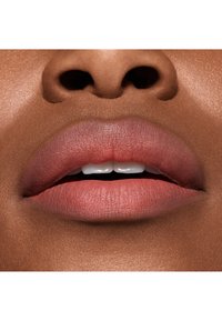 MAC Lippenstift in matter Rosénuance mit glatter, spitzer Spitze. Schwarzes zylindrisches Etui mit goldenem Logo, abgeschlossen mit einer runden, glatten schwarzen Kappe.