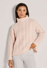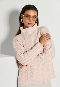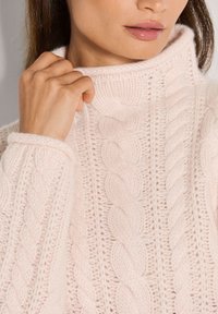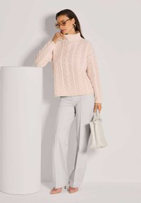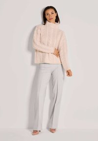 Frau in einem hellrosa Grobstrickrollkragenpullover und hellgrauen Hosen, die vor einem einfarbigen beigen Hintergrund posiert.