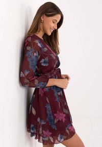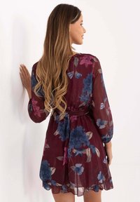 Florales Wickelkleid in Burgunderrot mit blauen und lila Blumen, mit langen Ballonärmeln und Taillengürtel. Transparentes, leichtes Material.