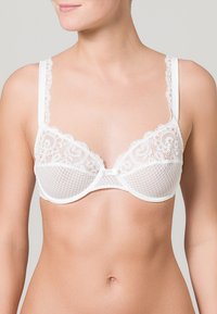 Maison Lejaby bringt uns einen wahren Klassiker unter den BHs: einen romantischen Bügel-BH aus zarter Spitze in klassischem Weiß.