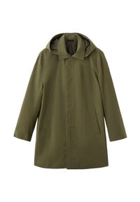 Junger Mann, der einen olivgrünen, geknöpften Mantel über einem hellblauen Hemd und beigen Hosen trägt, steht vor einem schlichten hellen Hintergrund.