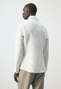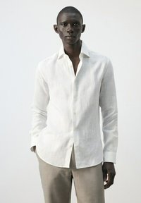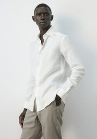 Mann trägt ein weißes langärmliges Hemd mit Knöpfen und hellbeige Hose, steht mit einer Hand in der Tasche vor einem schlichten Hintergrund.