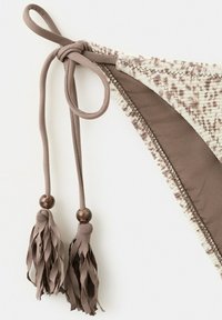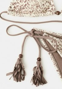 Zweiteiliger Bikini mit beige-braun gesprenkeltem Muster, Dreieck-Top mit Bändern zum Binden und passenden Höschen mit seitlichen Bändern und Quasten.