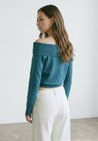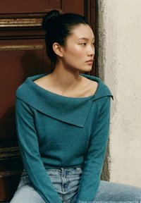 Junge Frau trägt einen türkisfarbenen schulterfreien Pullover und weiße Hose, steht mit einer Hand in der Tasche vor einfarbigem Hintergrund.