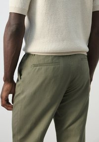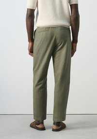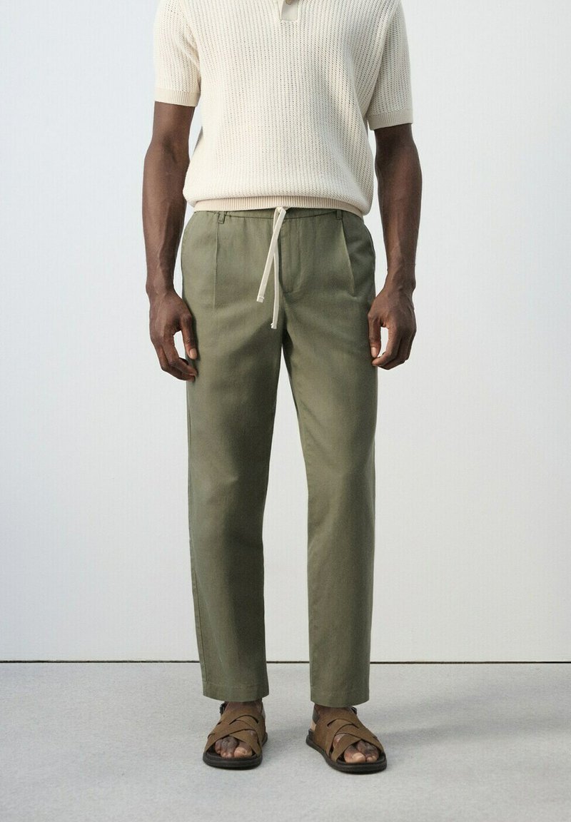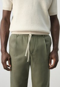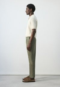 Mann trägt olivgrüne Hose mit Kordelzug, cremefarbenes kurzärmeliges Strickshirt und braune Ledersandalen, steht auf grauem Boden.