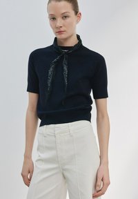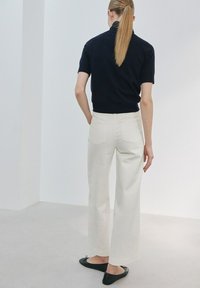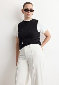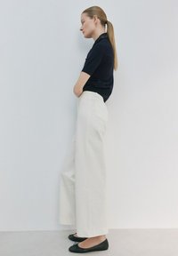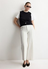 Frau trägt hoch taillierte, weit geschnittene, cremeweiße Hose, schwarzes Kurzarmoberteil, schwarze Ballerinas, steht vor einem einfarbigen hellen Hintergrund.