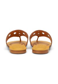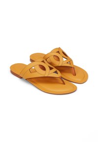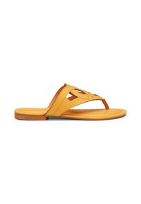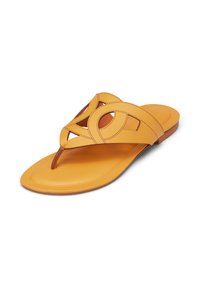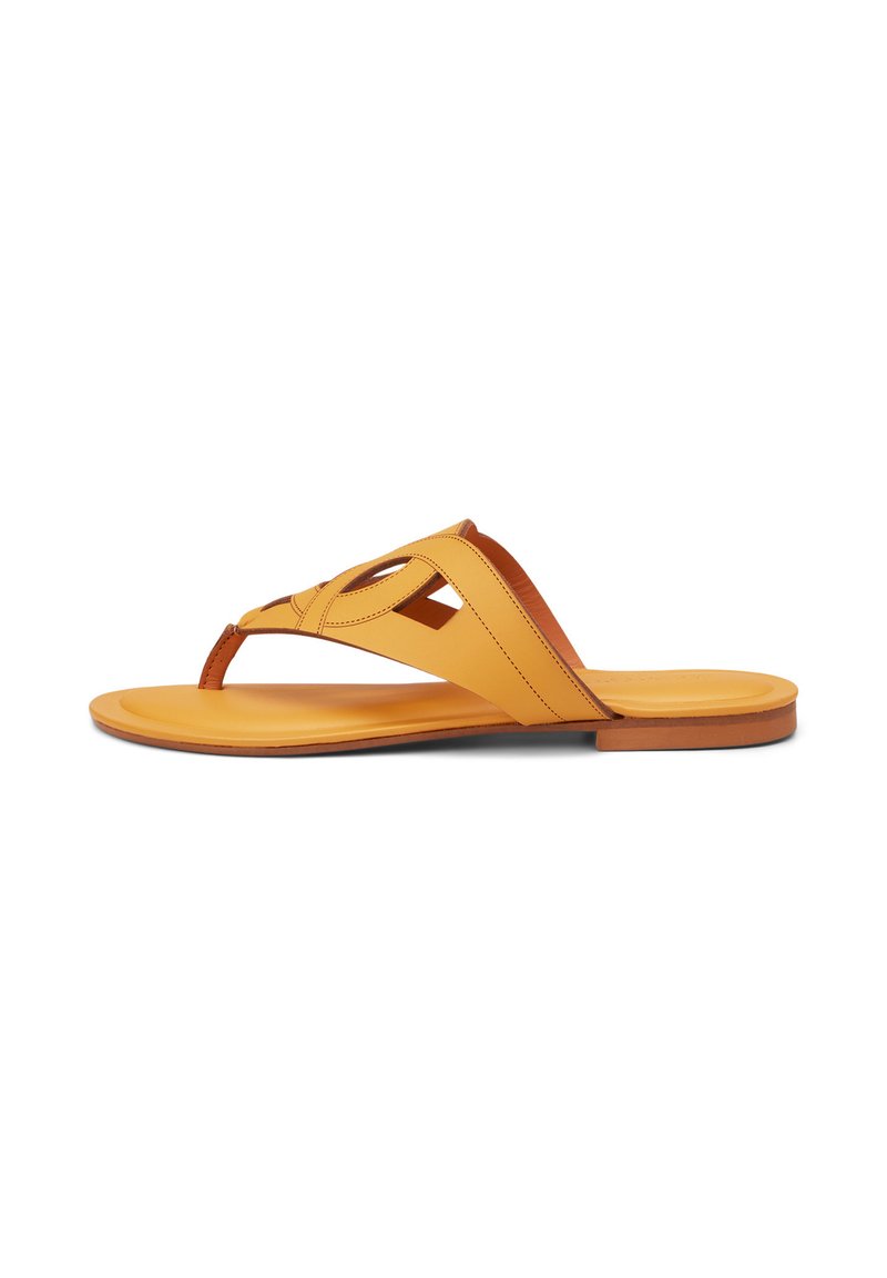 Gelbe Lederflip-Flops mit einem T-Riemen-Design, das ausgeschnittene Details und eine flache Holzsohle aufweist. Glatte Textur mit minimalistischen Akzenten.