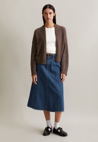 Brauner Strickcardigan mit offener Vorderseite, geripptem Saum und herunterhängenden Schultern, getragen über einem weißen, enganliegenden Oberteil und einem blauen Jeansrock.