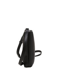 Schwarze Leder-Handytasche mit strukturiertem Oberflächendesign, Druckknopfverschluss und verstellbarem Trageriemen. Verfügt über eine Fronttasche für zusätzlichen Stauraum.