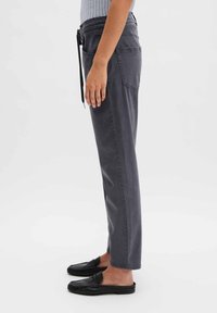 Person, der dunkelgraue Hose mit Kordelzug und schwarze Slip-on-Loafer trägt, steht vor einem einfarbigen hellen Hintergrund.