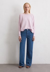 Helles rosa Langarmoberteil mit weitem Ausschnitt, weichem Material und lässiger Passform, kombiniert mit dunkelblauen, geraden Jeans.