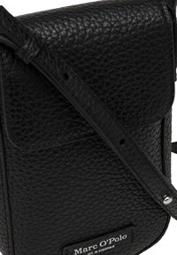 Schwarze Umhängetasche aus strukturiertem Leder mit Klappverschluss und verstellbarem Riemen, Marc O’Polo-Logo unten in der Mitte vorne.