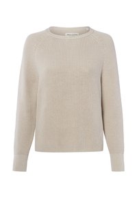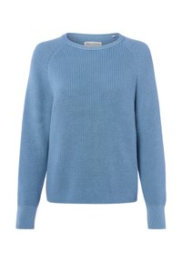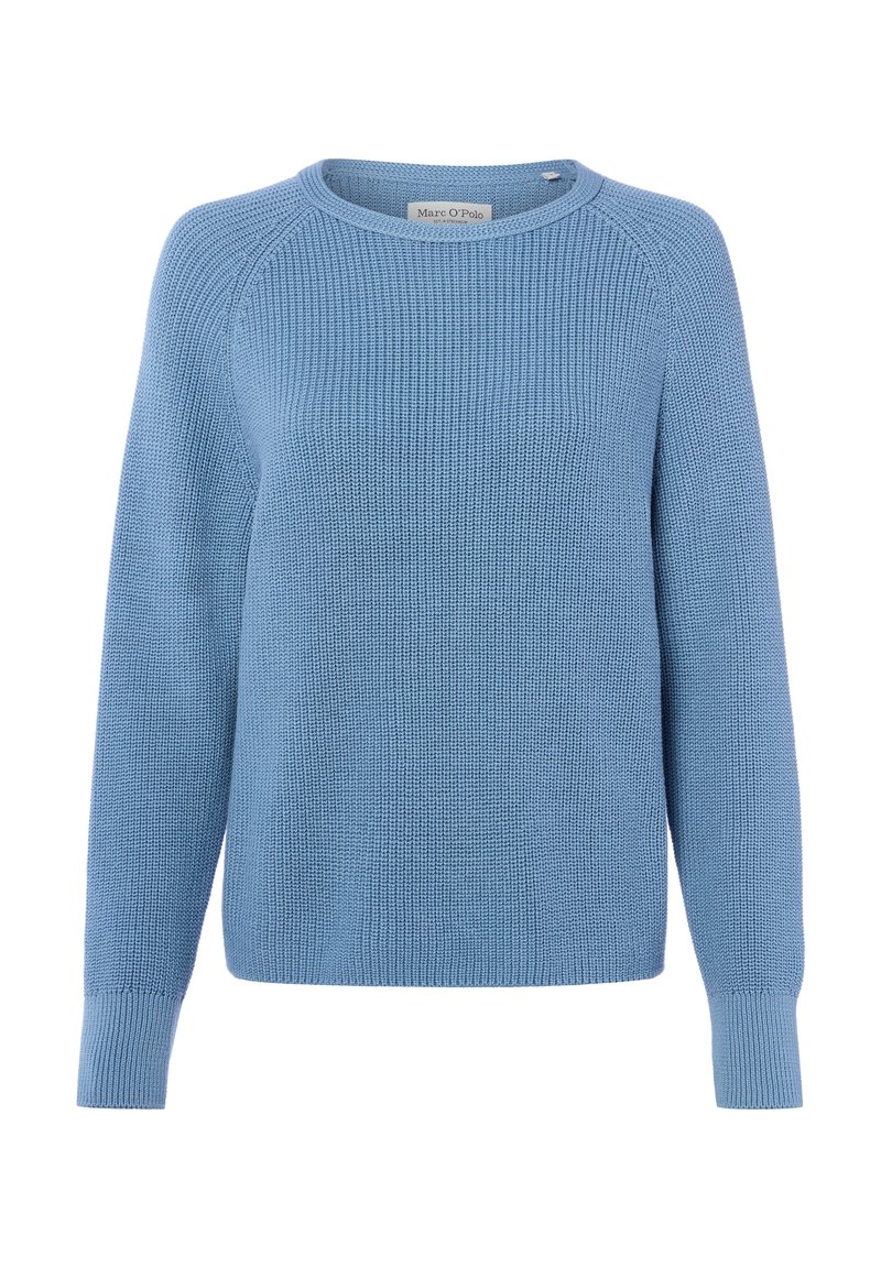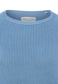 Hellblauer, gestrickter Langarmpullover mit Rundhalsausschnitt und gerippten Bündchen, mit dem Etikett Marc O'Polo.