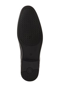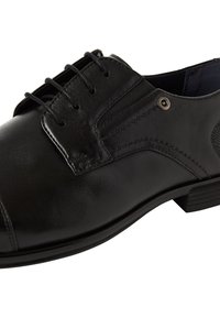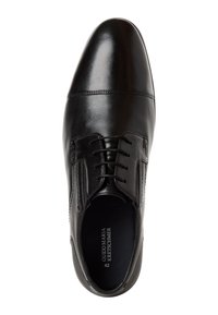 Schwarzer Leder-Herrenschuh mit glatter Oberfläche, spitz zulaufender Spitze und Schnürdesign. Verfügt über strukturierte Akzente an Ferse und Seitenpaneel.