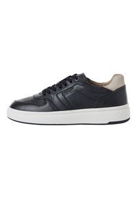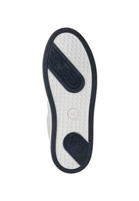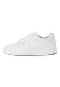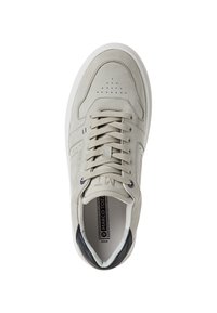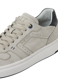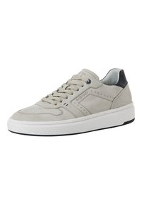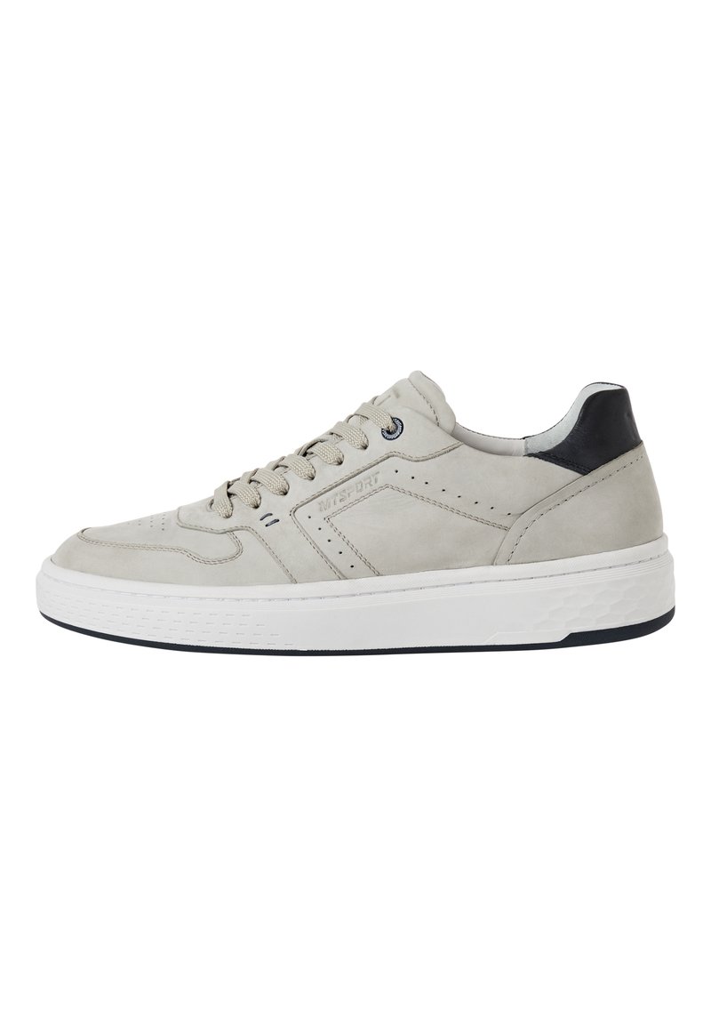 Hellgrauer Sneaker aus Wildleder mit weißer Gummisohle. Verfügt über einen schwarzen Absatz, runde Schnürsenkel und ein perforiertes Design an den Seiten.