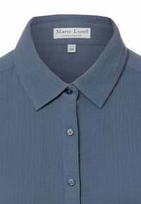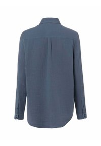 Langärmliges Hemd mit Knopfleiste aus einem schattierten, strukturierten blauen Stoff. Es verfügt über einen klassischen Kragen, einen leicht geschwungenen Saum und passende Knöpfe entlang der Vorderseite.