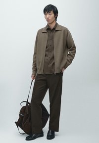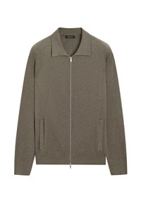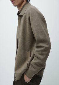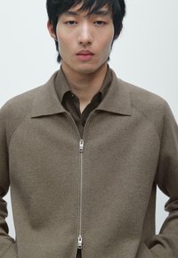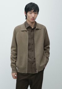 Brauner Strickcardigan mit Reißverschluss, Raglanärmeln und Seitentaschen, getragen über einem dunkelbraunen Hemd mit Knöpfen. Einfaches Design, glatte Textur.