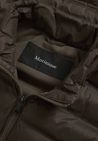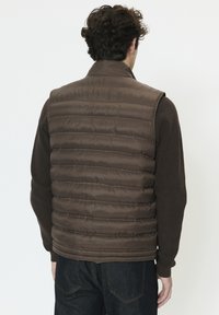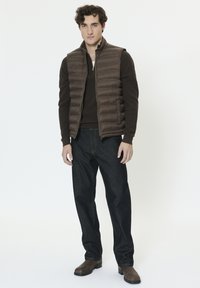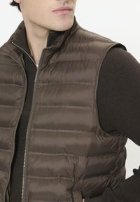 Junger Mann mit dunklen lockigen Haaren, der eine dunkelbraune gesteppte Weste über einem braunen Pullover trägt, die Hände in den Westentaschen, stehend vor einem weißen Hintergrund.