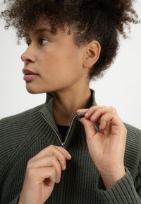 Grüner Strickpullover mit hochgeschlossenem Kragen und halbem Reißverschluss, mit geripptem Muster und Raglanärmeln. Der Saum hat einen geraden Abschluss.