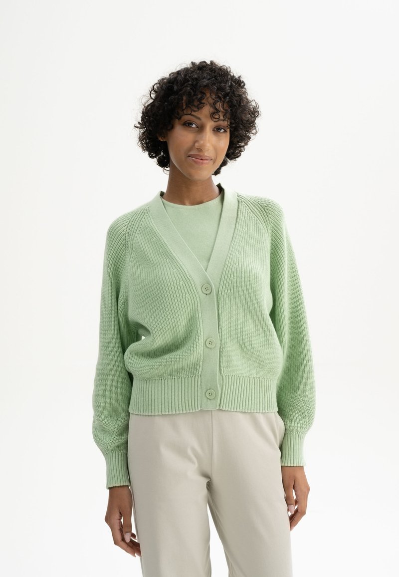 Grüne Strickjacke mit V-Ausschnitt, Rippenbündchen und Saum. Verfügt über vordere Knöpfe und strukturierte Muster, getragen über einem passenden Oberteil.