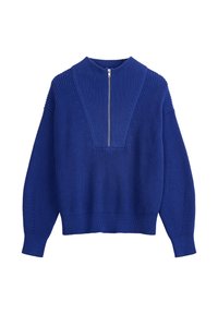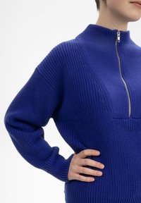 Lila Strickpullover mit hohem Kragen und asymmetrischem Reißverschluss. Verfügt über gerippte Bündchen und Saum sowie strukturierte Muster überall. Bequeme Passform.