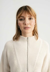 Beige Strickpullover mit hohem Kragen, halbem Reißverschluss und strukturiertem Muster; hat weite Ärmel und einen gerippten Saum, getragen über hellen Jeans.