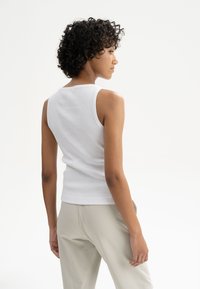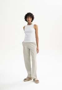 Weißes, geripptes Tanktop mit Rundhalsausschnitt und ärmellosem Design, kombiniert mit hellbeigen Hosen, vor einem schlichten Hintergrund präsentiert.